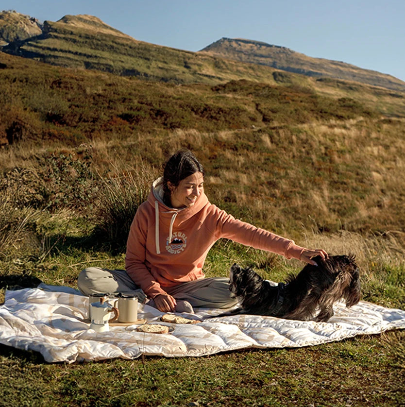 La manta outdoor (137x200 cm) está pensada para usar en exteriores: pícnics, playa o montaña. Es más ligera, fácil de plegar y cuenta con una base impermeable que la hace perfecta para exteriores y con menor relleno interno para obtener una temperatura confor por encima de los 10º, perfecta para la temporada de primavera y verano.
