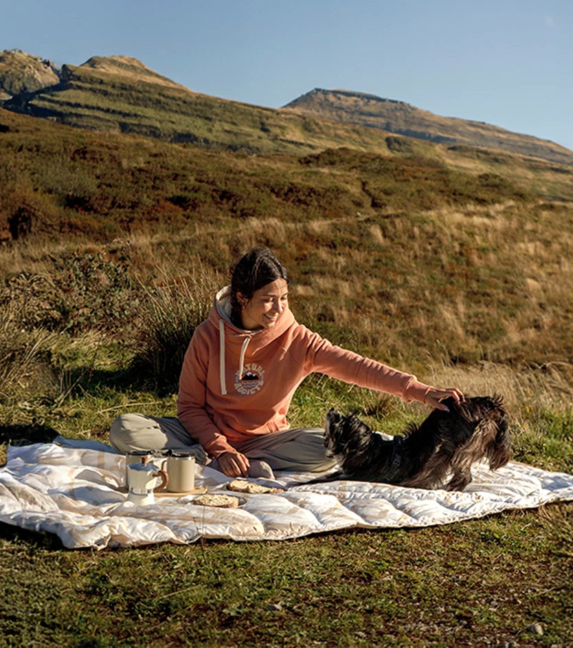 La manta outdoor (137x200 cm) está pensada para usar en exteriores: pícnics, playa o montaña. Es más ligera, fácil de plegar y cuenta con una base impermeable que la hace perfecta para exteriores y con menor relleno interno para obtener una temperatura confor por encima de los 10º, perfecta para la temporada de primavera y verano.