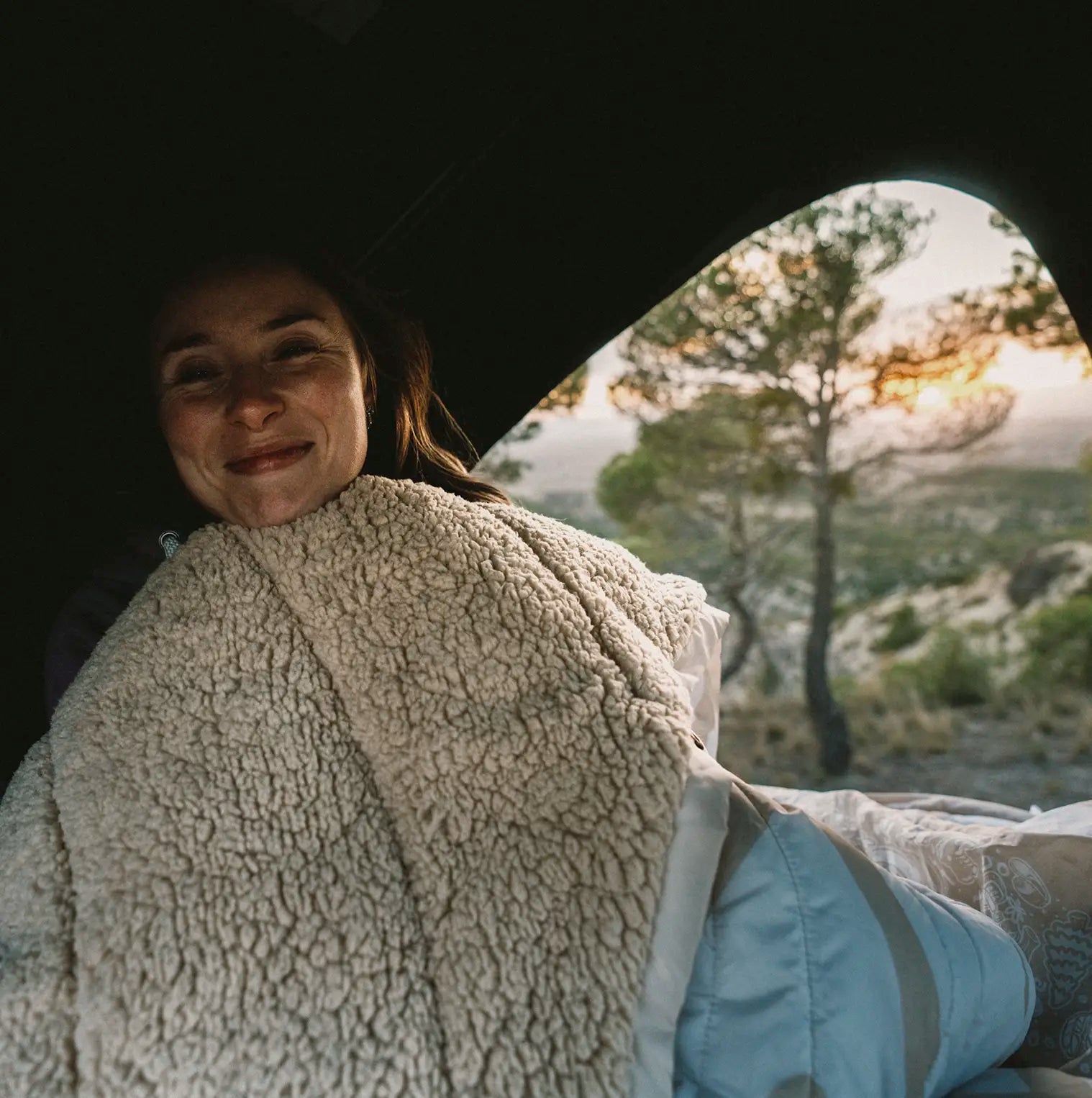 La manta camper individual (137x200 cm). Está pensada para una persona y es ideal para camas camper más estrechas, tiendas de techo o para usar como manta auxiliar en cualquier momento del viaje. Su interior sherpa ofrece un abrigo suave y acogedor, perfecto para las noches más frías con una temperatura de confort de 0º a 10º.