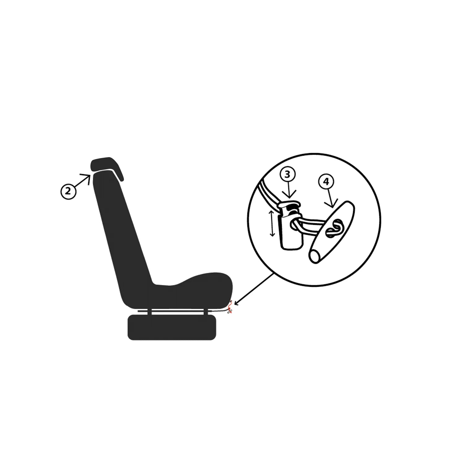 2º If your seat has armrests, insert them through the side Velcro openings, and the backrest adjustment wheel through the circular opening ⓶. Finally, pull the tensioner located at the bottom of the cover to tighten it ⓷ and tie the elastic cord end to the seat adjustment bar ⓸ to prevent the cover from moving.