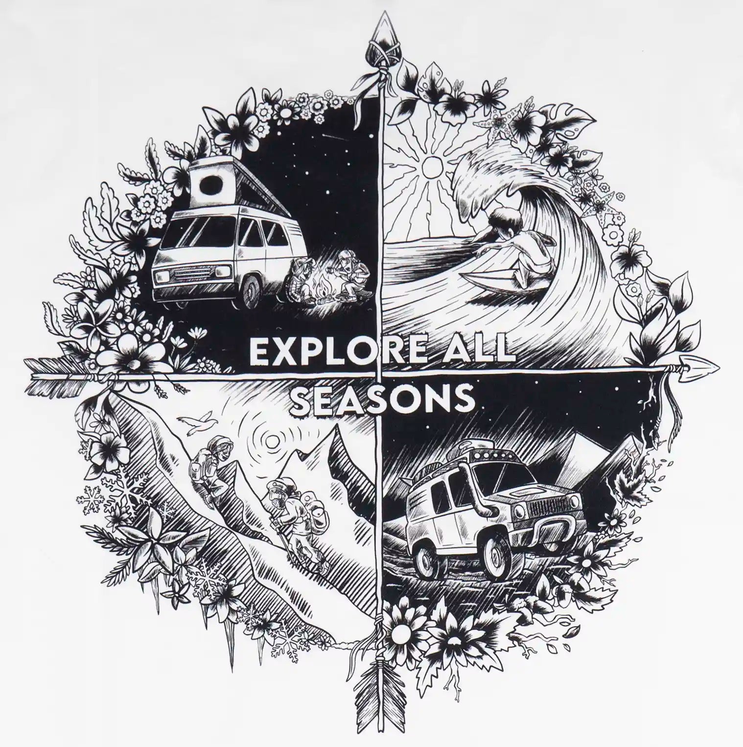 Maglietta Vanlife dal taglio femminile, perfetta per viaggiare in tutte le stagioni dell'anno. Disegno realizzato dall'artista Luisete Álvarez in cui esprimiamo il nostro amore per l'avventura e per i viaggi in camper, indipendentemente dalla stagione in cui ci troviamo.
