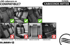 Questa versione è compatibile con i poggiatesta dei sedili posteriori dei furgoni Rifter, Citroën Berlingo, Opel Combo, Renault Kangoo, Dacia Dokker e altri modelli, nonché con tutti i poggiatesta che si adattano alla forma e alle dimensioni indicate nella tabella delle taglie e nella guida di compatibilità. (Vedi immagine di compatibilità)