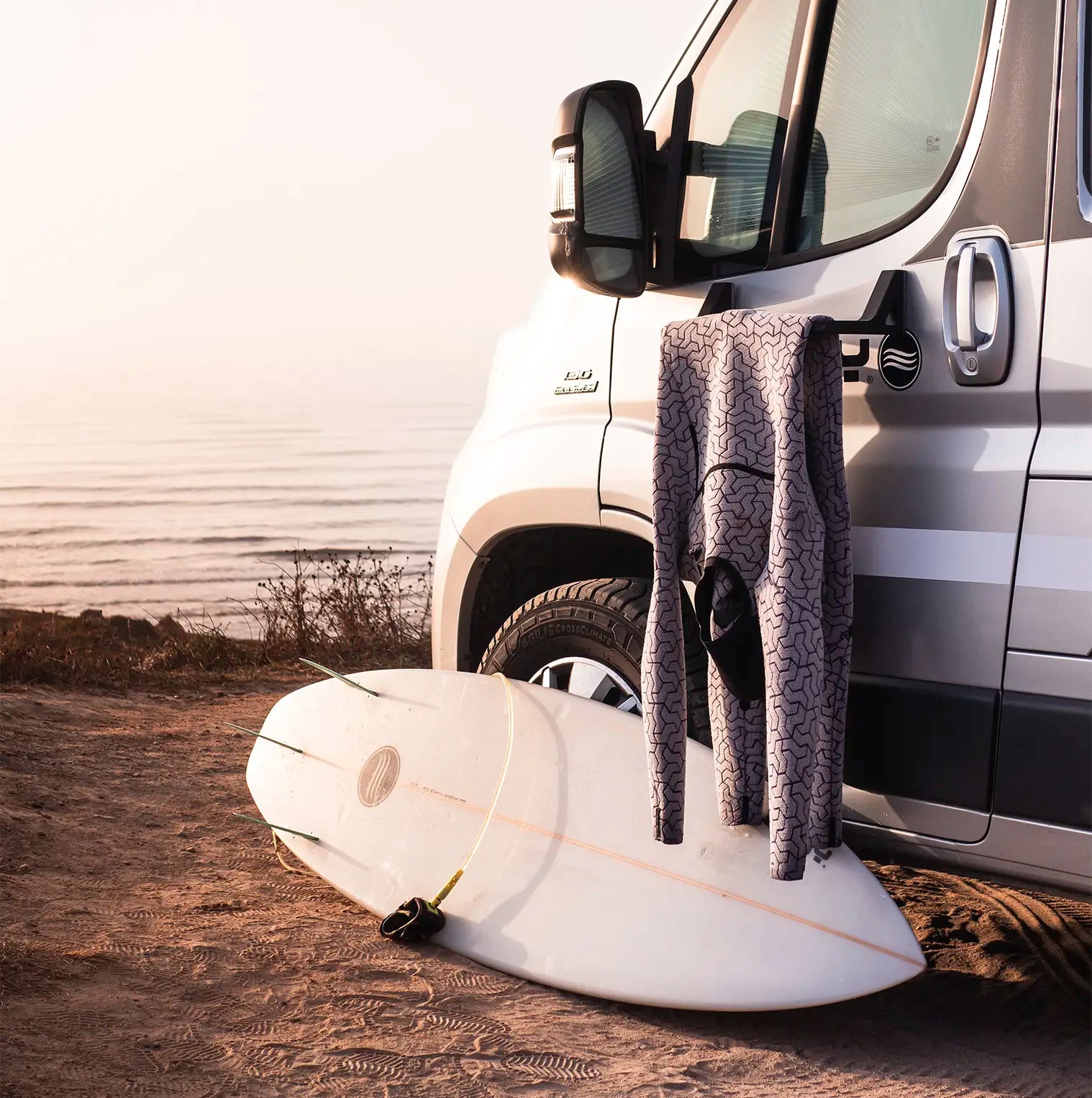 Colgar el neopreno mojado del espejo retrovisor de tu vehículo puede ser lo más común, pero no es lo más recomendable. El agua salada lo corroe todo, y la carrocería de tu furgo no va a ser una excepción.