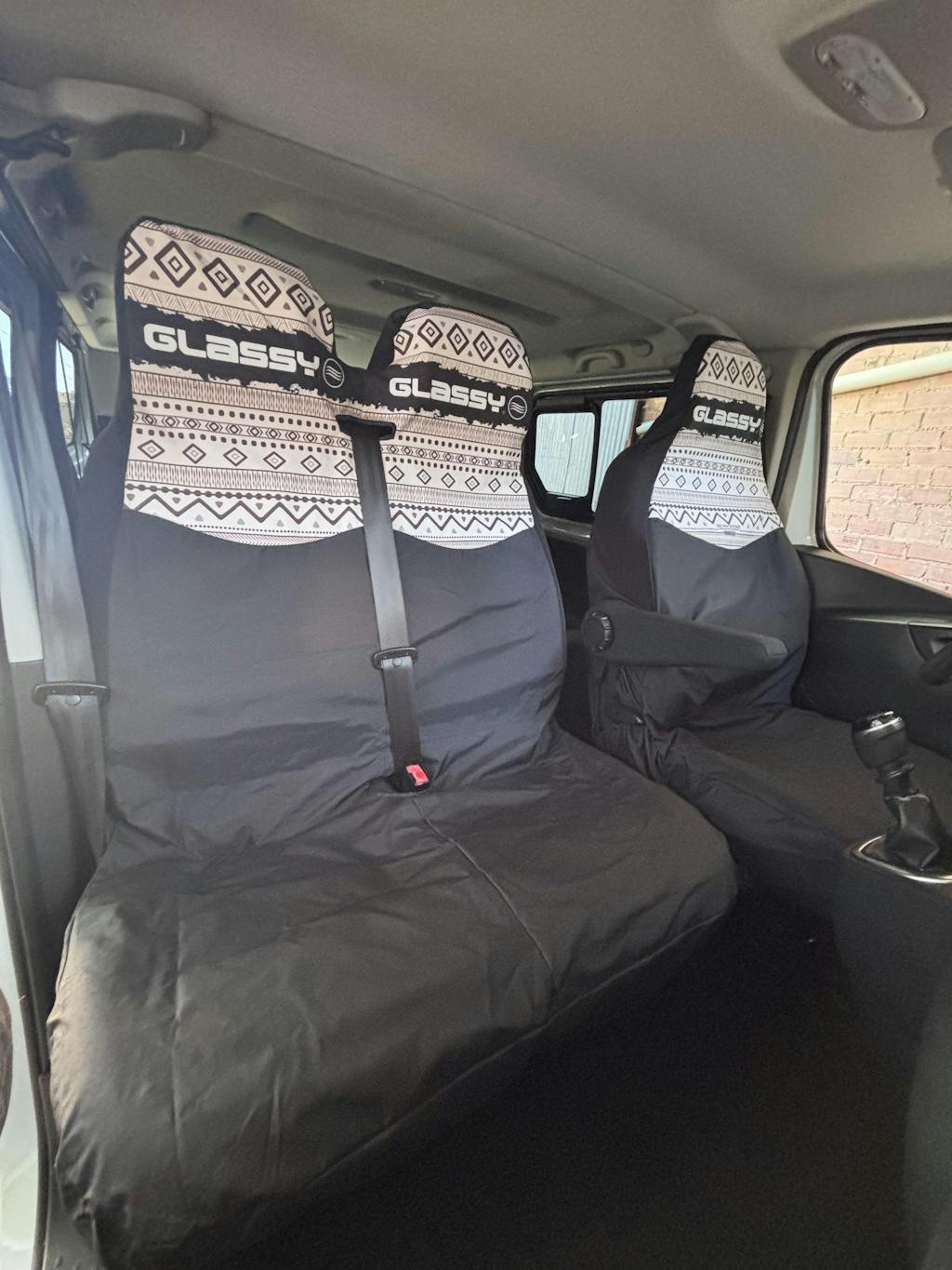 ¿Quieres proteger el asiento de tu furgoneta camper? La funda impermeable Glassy es la mejor funda asiento camper que encontrarás. Esta versión doble cuenta con abertura central mediante cinta de cierre de la marca VELCRO® para pasar el cinturón de seguridad, y se adapta perfectamente a la mayoría de asientos dobles delanteros de furgonetas tipo VW Transporter, Opel Vivaro, Renault Trafic, Ford Transit custom, etc. (consultar en caso de duda).
